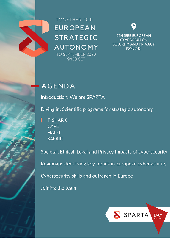 The 4th edition of the SPARTA Days will happen on the 10th September, 9H30 CET, on the 5th IEEE European Symposium on Security and Privacy! The event will be held online, a link to join will be sent later. Registrations to EuroS&P are not necessary not join this specific event. If you are interested in the rest of the Euro S&P symposium, the registrations are done through this link: https://ieee-euro-sp-2020.consorzio-cini.it/registration